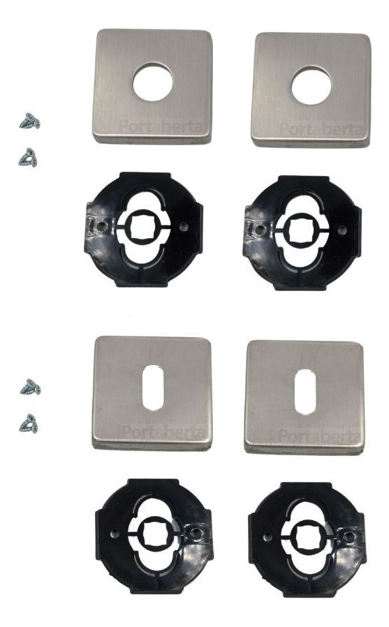 2 ROSETAS 091 (PAR) EM AÇO INOX TIPO QUADRADA COM FURAÇÃO DE ENCAIXE PARA MAÇANETA, COM DIMENSÃO ESPESSURA 6MM X LARGURA 47,2 MM, COM SISTEMA FIXAÇÃO SOBRE PRESSÃO COM OS FIXADORES EM TERMOPLÁSTICOS, SEM PARAFUSOS APARENTES. ACOMPANHA OS PARAFUSOS E FIXADORES DE TERMOPLÁSTICOS.